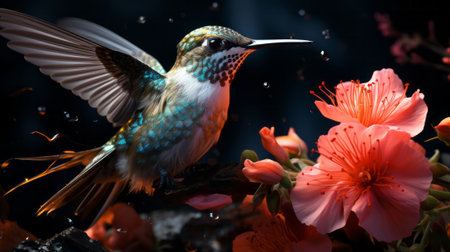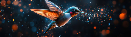 Vibrant hummingbird in midflight, colorful particle effects, dark moody background