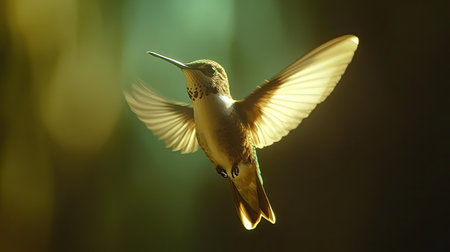 A delicate hummingbird in mid-flight, its tiny body merging with the soft lines of a sunlit forest glade.