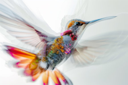 Multi colored hummingbird hovers mid air, spreading iridescent wings for pollination generated by artificial intelligence