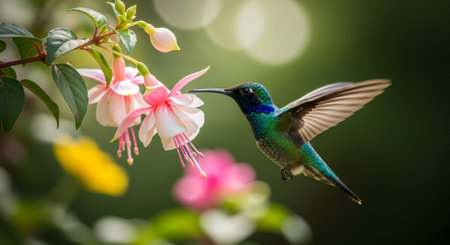 A hummingbird hovers near a vibrant pink flower with green leaves. The bird, with colorful plumage, is captured in mid-flight against a soft green and yellow background. The image has a shallow depth of field, with soft lighting. Potential uses include editorial content and commercial applications.