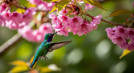 Hummingbird sipping nectar from pink cherry blossoms in springtime