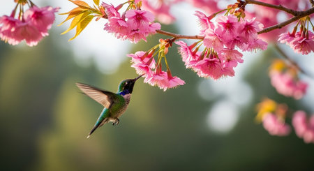 A hummingbird hovers near a branch adorned with pink blossoms. The image showcases soft focus and delicate textures, with the bird's wings subtly blurred. The lighting suggests an outdoor environment, perhaps during daylight. This visual could be used for various commercial or editorial applications.