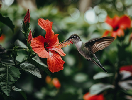 Hummingbird feeding on red flower in garden, hummingbird in flight,nature scene
