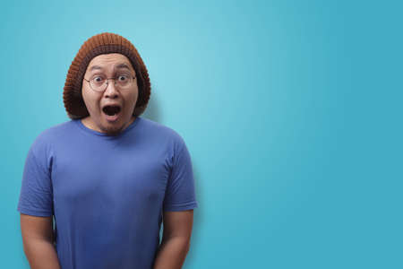 Portrait of young funny Asian man shocked or surprised expression with mouth open, against blue background