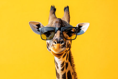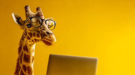 A cheerful giraffe dons stylish glasses while concentrating at a laptop, set against a vibrant yellow backdrop, exuding creativity and fun in a lively workspace vibe.