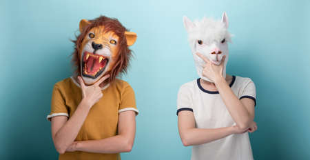 Young woman in lion mask and alpaca mask with hand on chin, thinking and making decision, pensive expression, isolated on blue background