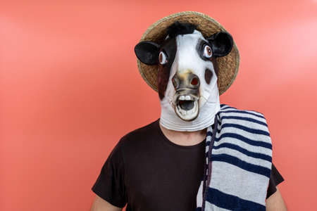 person in cow's head costume with towel and straw hat ready to go to the beach with pink background
