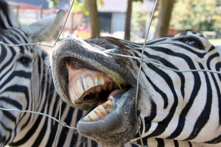 zebra in zoo shows teeth through fence, brushing teeth would be announced