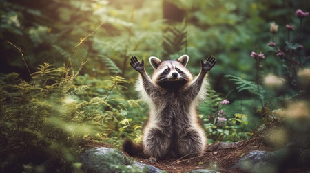 Playful raccoon standing on hind legs in a lush green forest surrounded by flowers, showcasing curiosity and charm in a serene outdoor setting