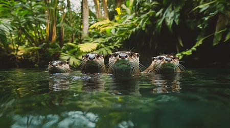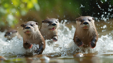 group of otters playing in a river, with lush greenery and rocks in the background.