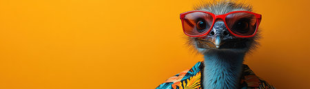 Ostrich in sunglasses on a sunny day. Close-up