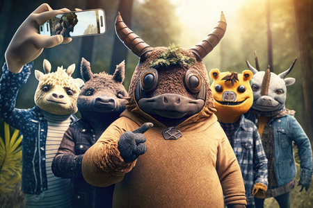 Group of wild animals taking a selfie in the forest with a smartphone