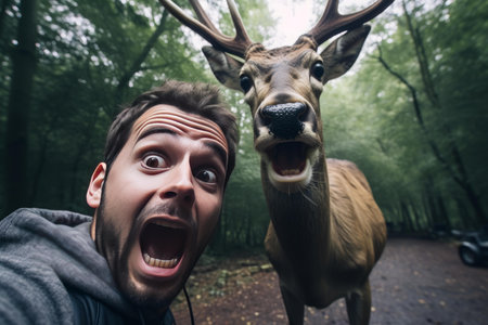 Unpredictable Scared man selfie with park squirrel. Wow photo. Fictional person. Generate Ai