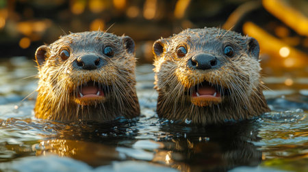 Two curious river otters swimming side by side, their wet fur glistening as they stare towards the camera.