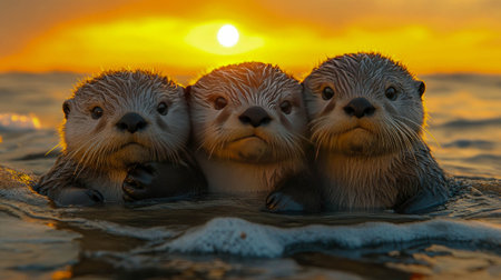 Otter family at the bank of the forest river with setting sun shining. Group of wild animals in nature.