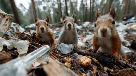 Three inquisitive squirrels explore a litter-strewn forest floor, showcasing the contrast between wildlife and human pollution. This engaging image highlights the impact of waste on natural habitats.