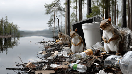 This image depicts squirrels scavenging along a polluted shoreline, surrounded by trash and debris, representing the urgent need for environmental awareness and conservation efforts.