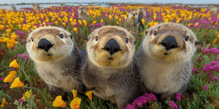 Three playful otters with endearing expressions pose amidst a field of vibrant wildflowers, creating a joyful scene in nature.