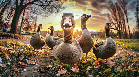 Elderly man playing with his flock of geese in the park