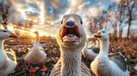 Funny screaming white goose against a blue sky background