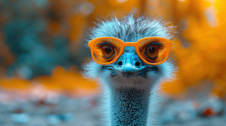 blue heron wearing glasses and sticking out a beak, rendered in cinema4d, is a consumer culture critique with explosive pigmentation. this post-70s ego generation-inspired artwork combines a soviet lens with visual puns, showcasing a unique blend of navy and amber tones. ai generated