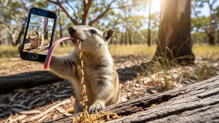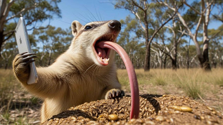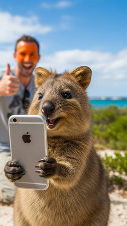 A quokka holds a smartphone and sticks out its long tongue in a natural outdoor setting