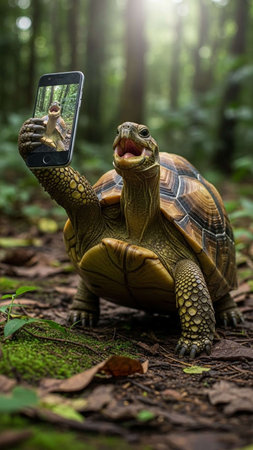 A tortoise taking a selfie in a forest with its mouth open