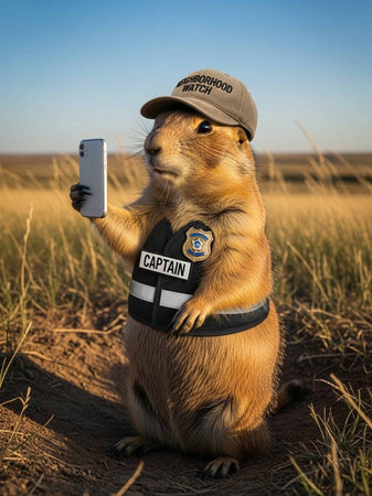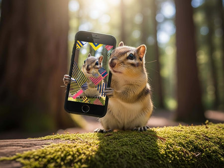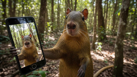 A beaver in a construction site taking a selfie with a smartphone