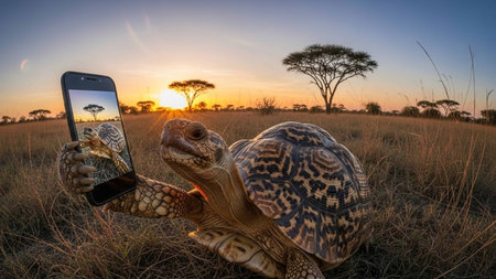 A large tortoise holding a camera in a dry field with trees