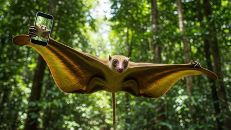 A crocodile takes a selfie in a lush green forest with a smartphone