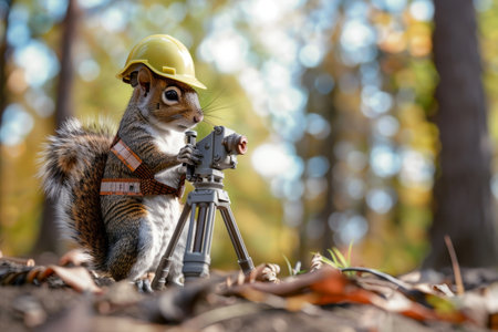 A squirrel wearing a yellow hard hat and a camera. The squirrel is standing in front of a tripod