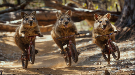 An AI generated illustration of three beavers cycling in the forest with mouths agape