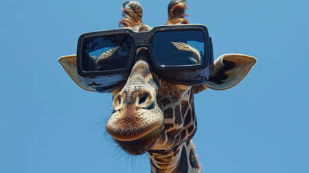 A happy giraffe with its neck bent, wearing oversized glasses and a silly grin.