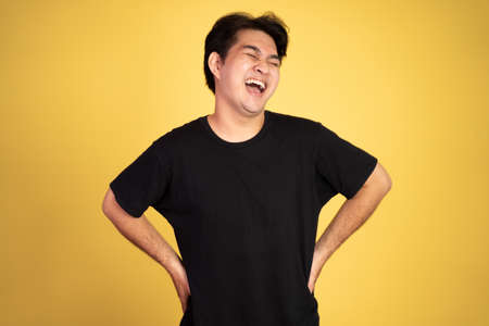 happy asian young man laughing naturally on studio background