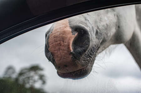 An extremely closeup detail view of horse snout taken through the car glass. Scary fantasy horror view of monster head