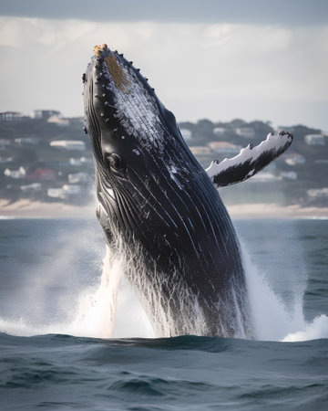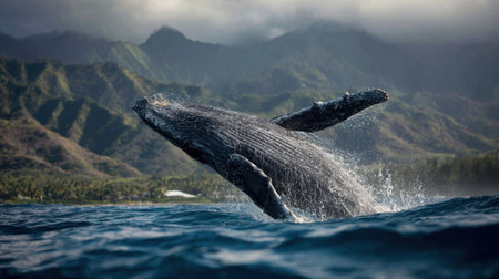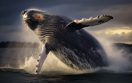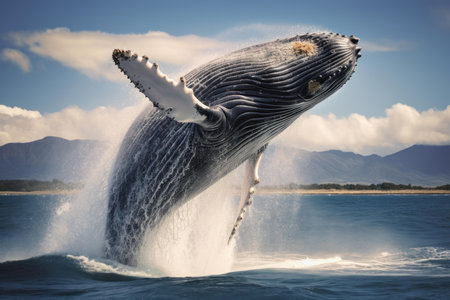 A breathtaking scene captures a whale breaching the ocean's surface, creating dynamic splashes and reflecting the beauty of marine life in nature's environment.