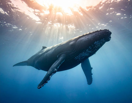 Majestic humpback whale gliding through ocean waters, illuminated by rays of sunlight penetrating the surface above.