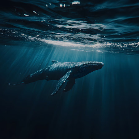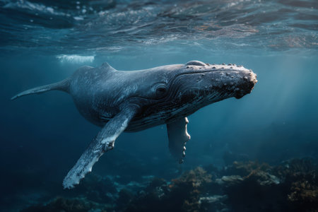 A dramatic underwater scene featuring a massive humpback whale gliding gracefully through the deep blue ocean. Sunbeams penetrate the water, illuminating the gentle giant in an ethereal glow.