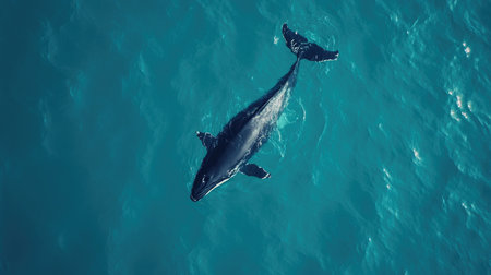 whale captured from above, gracefully gliding through the serene turquoise ocean depths.