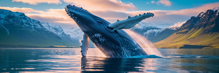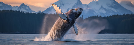 A magnificent humpback whale erupts from the deep blue waters, sending a spray into the air as it breaches. Framed by towering snow-capped mountains, this moment captures nature's splendor.