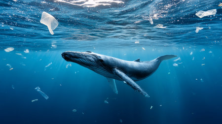 A whale swims in the ocean with plastic against the background of an ecological catastrophe. Concept of pollution of nature and the environment. Call for urgent action to protect the environment and waste disposal