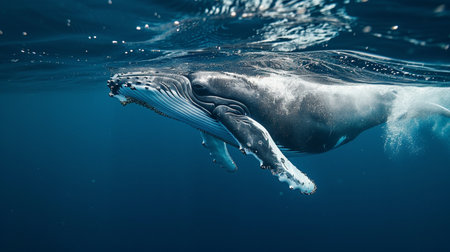Majestic whale gliding gracefully in deep blue ocean waters. concept of marine life, underwater exploration, oceanic beauty.