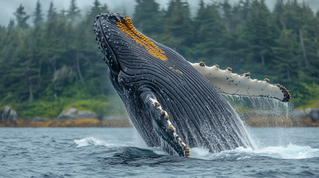 Humpback whale breaches the surface of the ocean showing its massive body and tail flukes amidst a serene coastal backdrop with dense trees.
