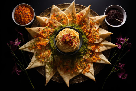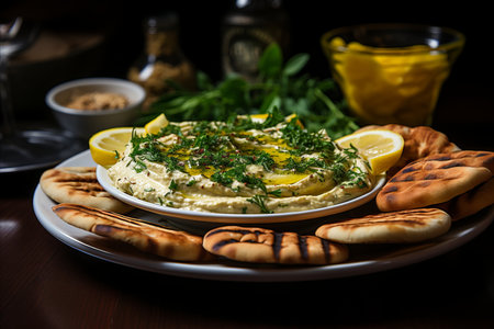 artistic arrangement of hummus and pita triangles, created with generative ai