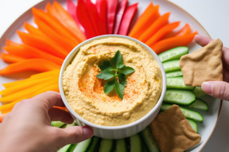 hand placing bell pepper slice into platter of hummus, created with generative ai