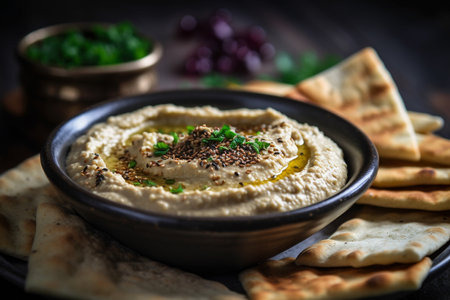 homemade hummus in a decorative bowl with pita bread, created with generative ai