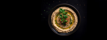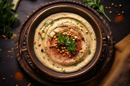 Gourmet Hummus with Edible Flowers and Spices on Dark Background