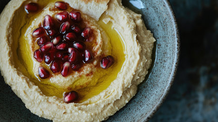 Explore this vibrant bowl of creamy hummus topped with pomegranate seeds and olive oil, perfect for serving as a healthy appetizer or snack.