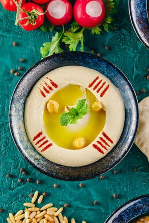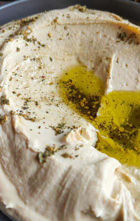 Traditional homemade chickpea hummus with olive oil and spices