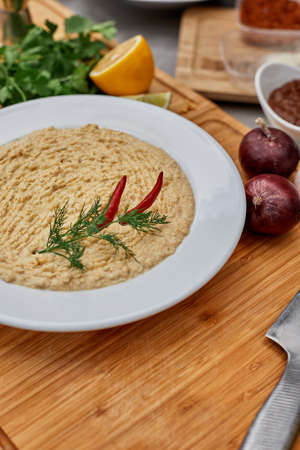 appetizing hummus in a deep bowl.Israeli cuisine.top view